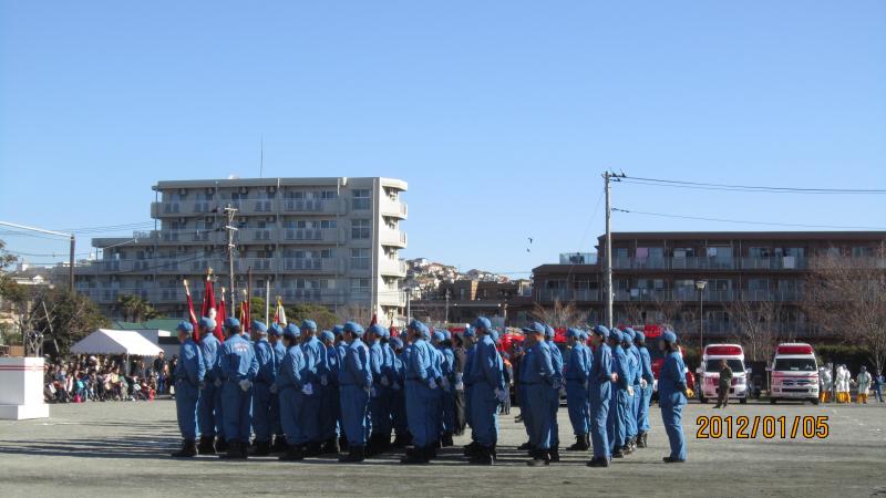 もう式典が始まっていて、凛々しい消防士の皆さんがびしっと並んでいます。