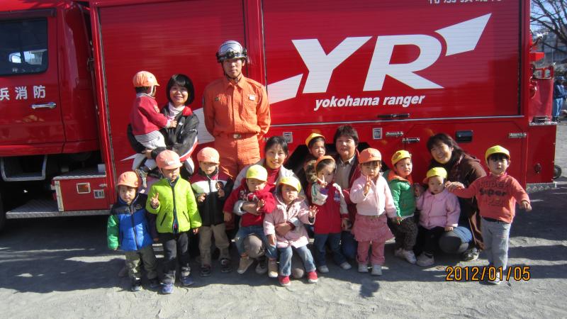 子どもたちはお散歩の途中でよく消防車を見に出かけます。