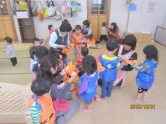 ひよこぐみさんも、先生にマントをつけてもらって、準備、準備~