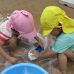 その泡を怪獣に見立てて水をかけて戦ったり、泡をこねてみたり、飛ばしてみたり、器に入れてみたり…とても集中して、そして思いっきり遊んでいました!