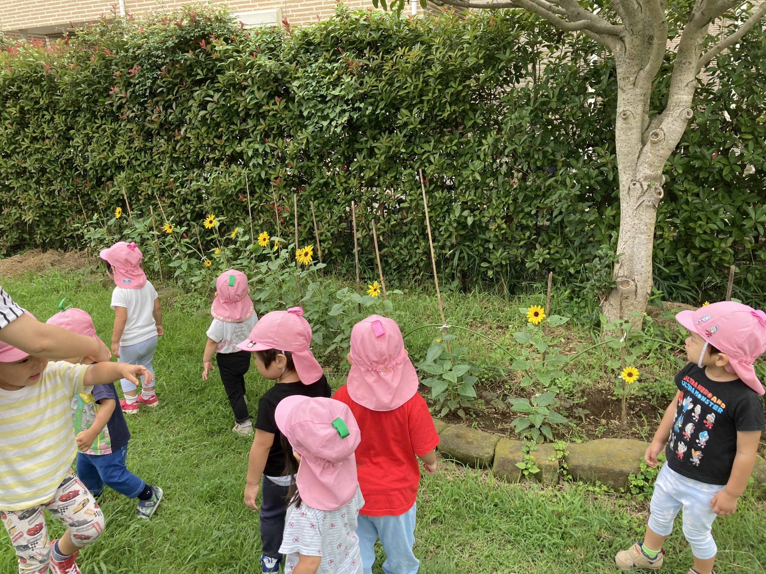 緑地には子どもの目線で見れる小ぶりのひまわりも咲いていて、目線と一緒でじっくり見れました。
